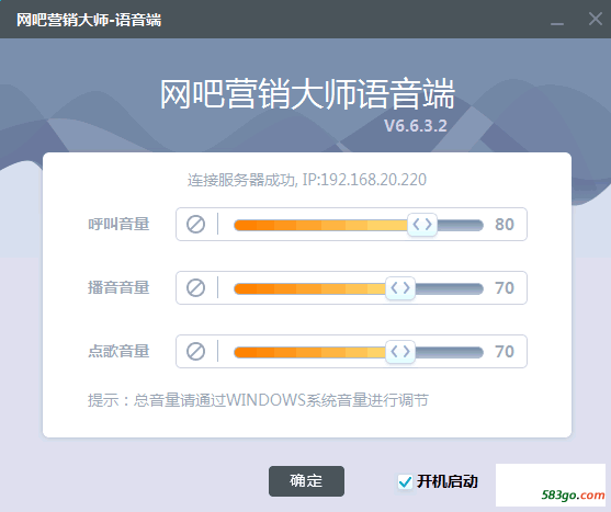 程序设置 通知区域有显示和退出选项,显示出来后,可以分别调节呼叫音量,播音音量,点歌音量。是否开机启动。确定选项窗口会最小化到任务栏,关闭选项会最小化到通知区域。