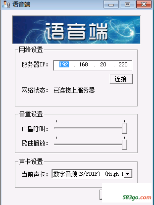程序设置 通知区域有退出和还原选项,还原主窗口后,可以设置服务器的IP,设置广播呼叫的音量,歌曲播放的音量,声卡的设置,隐藏到托盘、最小化和关闭选项功能一样,直接最小化到通知区域。