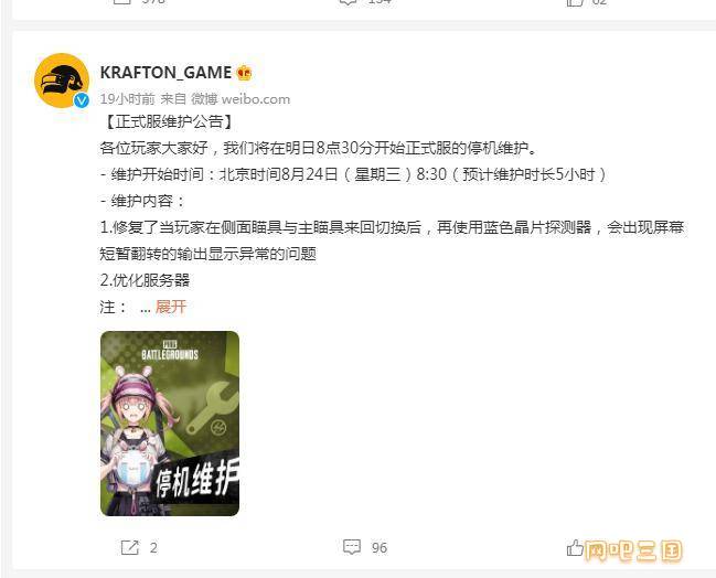 [正式服维护公告] 各位玩家大家好,我们将在明日8点30分开始正式服的停机维护。 - 维护开始时间:北京时间8月24日(星期三)8:30(预计维护时长5小时) - 维护内容: 1.修复了当玩家在侧面瞄具与主瞄具来回切换后,再使用蓝色晶片探测器,会出现屏幕短暂翻转的输出显示异常的问题 2.优化服务器 注:开服时间可能会根据具体情况进行调整。如果开服时间发生变化,我们将会及时进行公告。由此带来的不便还请大家谅解。pubg官方微博公告地址:https://weibo.com/PUBATTLEGROUNDS?is_all=1#_rnd1540362435820 ![]() |