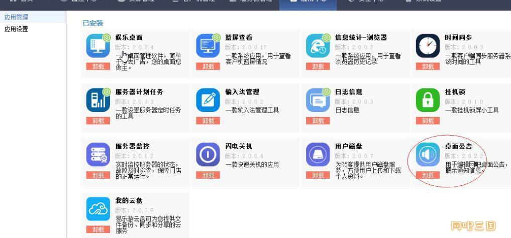 2.应用里面检查了下,安装了桌面公告这个应用,卸载掉,客户机重起就没有了